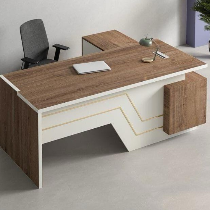 The Auralis Executive Desk is a sophisticated and modern workstation designed to enhance productivity and style in any professional or home office. Crafted from a combination of rich wood veneer and a sleek white base with gold accents, this desk features a spacious rectangular tabletop that accommodates a laptop, desk lamp, and other essentials, paired with a side storage unit for added functionality. The unique geometric design with integrated drawers and a sturdy base offers a blend of elegance and practicality.