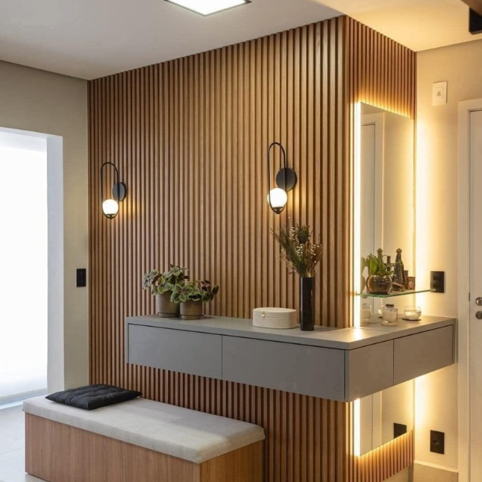 Step into luxury with the Aurora Glow Dressing Table, a stunning addition to any contemporary home. This sleek vanity features a floating design with a smooth, grey-finished tabletop crafted from high-quality wood, offering ample space for your essentials. The standout feature is the large, backlit mirror framed with soft, ambient LED lighting, providing perfect illumination for grooming or decoration. The backdrop of vertical wooden slats adds a warm, textured elegance, complemented by stylish wall-mounted pendant lights. Equipped with built-in drawers and a small shelf for organized storage, this piece pairs beautifully with the included wooden bench, upholstered in soft fabric for added comfort. Ideal for creating a welcoming foyer or a serene dressing area, the Aurora Glow Dressing Table combines functionality and sophistication—available now!