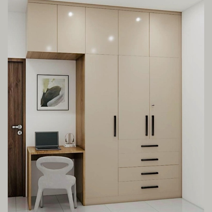 The Contemporary Wardrobe with Integrated Desk is a stylish and multifunctional storage solution for modern living spaces. Featuring a smooth beige finish with sleek black handles, this wardrobe offers ample storage with multiple hanging sections and drawers for clothes and accessories. The built-in wooden desk, complete with built-in lighting, provides a convenient workspace for laptops or study, complemented by a minimalist white chair. Designed for easy assembly and customization, this unit combines elegance and practicality, ideal for small apartments or bedrooms. Dimensions: [customizable based on need].