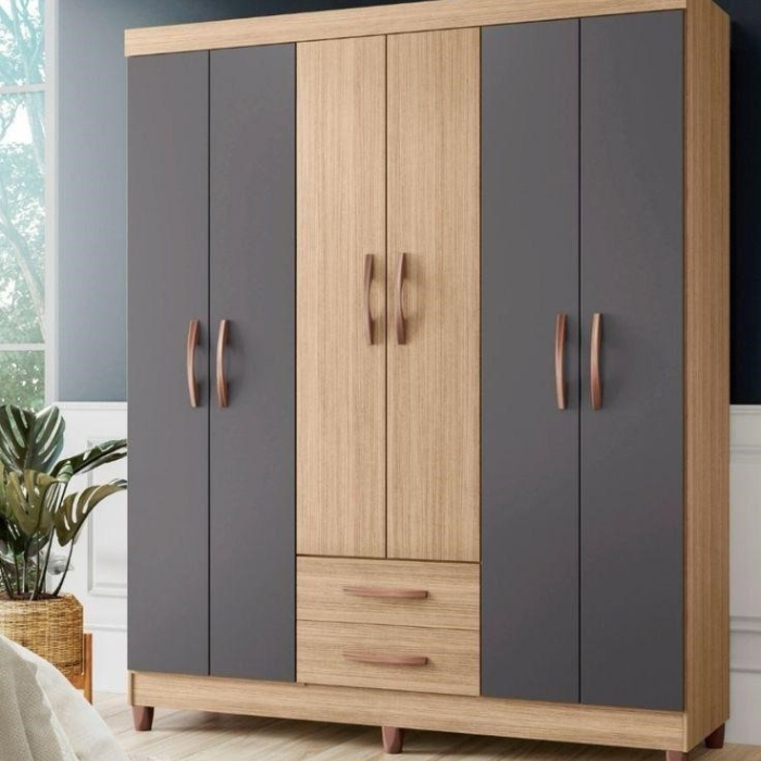 The Dual-Tone Modern Wardrobe with Drawers is a stylish and functional storage solution for contemporary bedrooms. Featuring a combination of warm wood and sleek gray finishes, this wardrobe includes four doors with elegant wooden handles, offering ample concealed storage for clothes and accessories. The lower section provides two spacious drawers for additional organization. Designed with a sturdy build and minimalist aesthetic, it’s easy to assemble and customizable, making it perfect for enhancing any living space. Dimensions: [customizable based on need].