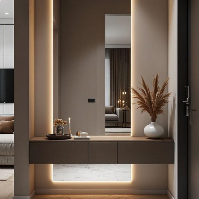 Redefine elegance with the Eclipse Radiance Dressing Table, a perfect fusion of modern design and functional beauty. Crafted from high-quality wood with a rich, warm finish, this floating vanity features a smooth tabletop with integrated drawers for discreet storage of your essentials. The centerpiece is a large, backlit mirror framed with soft, warm LED lighting, casting a gentle glow that enhances any space and provides ideal illumination for grooming. The minimalist design is accentuated by a vertical wooden accent wall, paired with subtle decorative elements like pampas grass and a small vase of flowers. Ideal for creating a welcoming foyer or a serene dressing area, this piece combines practicality with sophisticated style—available now!