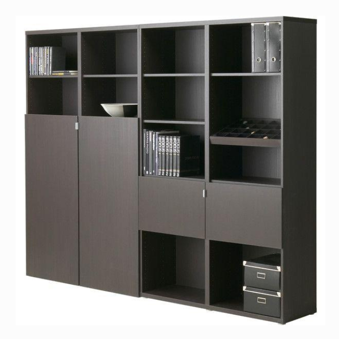 The Elara Modular Storage System is a sleek and versatile storage solution designed to enhance organization in any modern home or office. Crafted with a durable dark wood finish, this multi-functional unit features a combination of open shelves, closed cabinets, and drawers to accommodate a variety of storage needs. The system includes multiple compartments with adjustable shelving, allowing for customized organization of books, files, decorative items, and more. Two spacious cabinets with hinged doors provide concealed storage for personal or sensitive items, while a central drawer unit offers additional space for smaller essentials. A unique tray shelf with multiple slots is ideal for organizing office supplies or media accessories. Standing at an ergonomic height, the Elara Modular Storage System is easy to access and complements contemporary interiors with its minimalist design. Assembly is straightforward, and the sturdy construction ensures long-lasting use, making it a practical and stylish addition to any space.