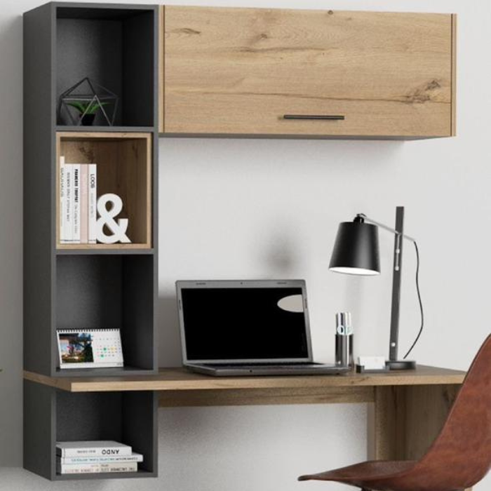 The ElevateWork Studio is a sleek and modern wall-mounted desk and shelving unit designed to optimize your workspace with style and functionality. Crafted with a combination of natural oak and matte gray finishes, this versatile furniture piece seamlessly blends into any home or office environment. The unit features a spacious desktop surface, perfect for accommodating a laptop, desk lamp, and essential office supplies, while the integrated open shelves and a closed cabinet provide ample storage for books, decor, and personal items. The sturdy construction ensures durability, and the wall-mounted design saves valuable floor space, making it ideal for small apartments or home offices. Included is a comfortable leather chair that complements the desk's aesthetic, offering ergonomic support for long hours of work. This all-in-one solution is easy to assemble and includes all necessary hardware for a hassle-free setup. Elevate your productivity with the ElevateWork Studio, a perfect balance of form and function.