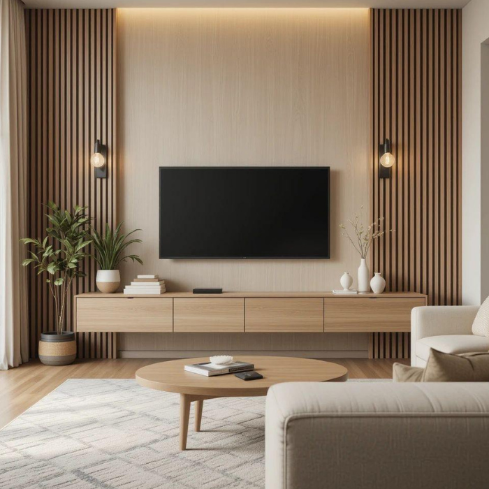 Create a serene and stylish living space with the Harmony TV Console Set, a perfect fusion of modern minimalism and natural warmth. This set features a sleek, floating wooden console with ample storage, complemented by vertical wooden slat accents on the wall for a textured, organic feel. Enhanced with elegant wall sconces and subtle LED lighting, it accommodates most flat-screen TVs while offering a cozy ambiance. Ideal for a contemporary home, this unit pairs beautifully with decor elements like plants and a round coffee table, promoting a balanced and inviting entertainment area.
