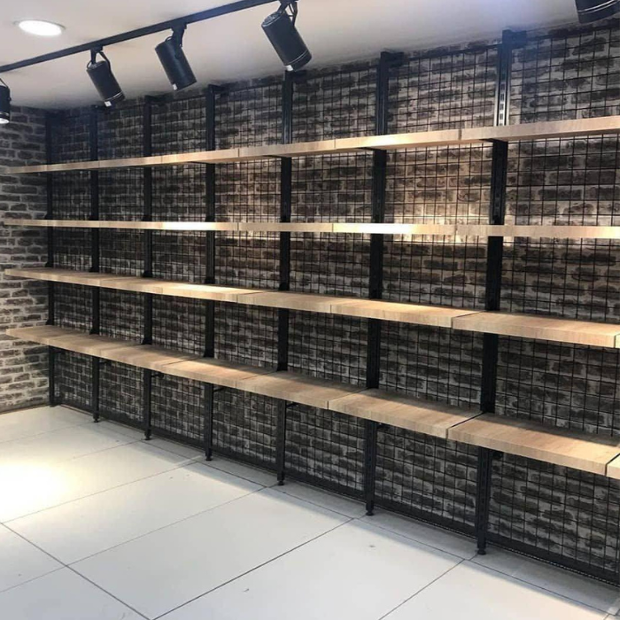 The Industrial Wall-Mounted Shelving Unit is a stylish and functional storage solution ideal for retail, cafes, or modern interiors. Featuring a robust black metal frame with integrated wire mesh backing and natural wood shelves, this unit combines durability with a contemporary industrial aesthetic. Designed for wall mounting, it maximizes floor space while offering multiple adjustable shelves for versatile storage of books, decor, or merchandise. Enhanced by overhead track lighting for optimal product visibility, this unit is easy to install and customize, blending seamlessly with brick or textured wall designs. Dimensions: [customizable based on need].