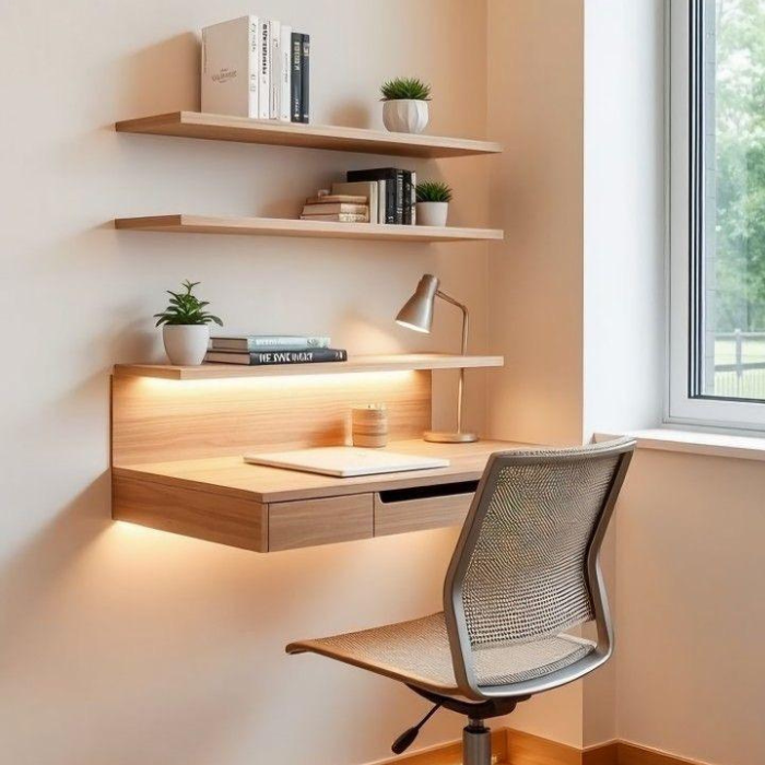 The Lumora Desk Haven is a sleek, modern wall-mounted desk designed to maximize space and enhance productivity in any home or office setting. Crafted from high-quality wood with a natural finish, this desk features a minimalist design with three floating shelves above the workspace, perfect for organizing books, plants, and decorative items. Integrated LED lighting along the desk edge provides soft, adjustable illumination to create an inviting atmosphere and reduce eye strain during late-night work sessions. The desk includes a single drawer with smooth-glide tracks for storing essentials like pens, notebooks, and cables. Paired with an ergonomic chair, the Lumora Desk Haven offers a comfortable seating experience with adjustable height and a breathable mesh backrest. Ideal for small spaces, this desk combines functionality with aesthetic appeal, making it a versatile addition to any room.