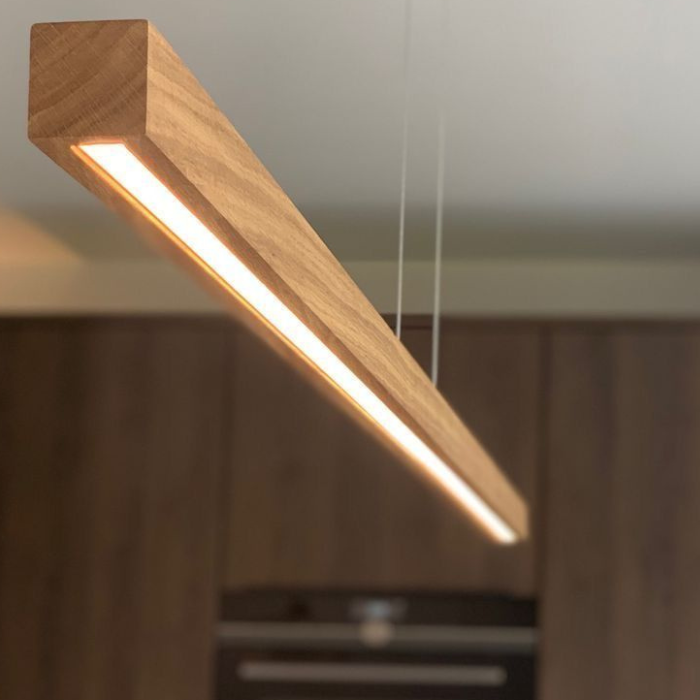 The Lumora Oak Pendant is a stylish and modern lighting solution designed to elevate the ambiance of any space. Crafted from high-quality oak wood, this pendant light features a sleek, elongated design that seamlessly blends natural elegance with contemporary aesthetics. The integrated LED strip emits a warm, inviting glow, providing ample illumination while highlighting the wood's rich grain texture. Suspended by discreet, adjustable cords, it allows for customizable height placement to suit various ceiling heights and room layouts. Ideal for kitchens, dining areas, or living spaces, this pendant is energy-efficient and built to last, offering a perfect combination of functionality and sophistication. Its easy installation process and durable construction make it a practical yet luxurious addition to any home decor.