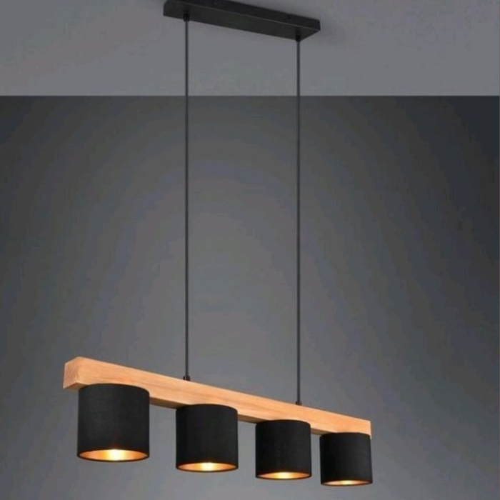 The Lumora Pendant Light is a stylish and modern lighting solution designed to elevate the ambiance of any living space. Crafted with a natural wooden beam as its centerpiece, this pendant light combines rustic charm with contemporary design. It features four cylindrical black fabric shades that emit a warm, inviting glow, perfect for dining rooms, kitchens, or living areas. The light is suspended from a sleek black ceiling mount with adjustable cords, allowing you to customize the height to suit your space.
