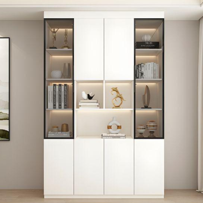 The is a sleek, modern storage solution designed to elevate the aesthetic of any living space. Crafted with a minimalist white finish, this unit features a combination of open shelves and closed cabinets, offering both display and concealed storage options. The integrated LED lighting highlights your decorative items, books, and collectibles, creating a warm and inviting ambiance. Constructed from high-quality materials, the Lumora ensures durability and stability with its sturdy frame. The glass-fronted compartments add a touch of elegance while protecting your items from dust. This versatile unit includes adjustable shelves for customizable storage, making it ideal for books, vases, trophies, or personal mementos. With its clean lines and neutral design, the Lumora Shelving Unit seamlessly blends into contemporary or traditional interiors, providing both functionality and style. Perfect for living rooms, offices, or hallways, this piece measures approximately 70 inches in height and 60 inches in width, offering ample space to organize your essentials.