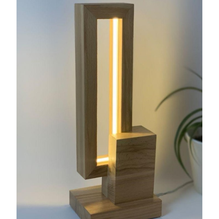 The Lumora Wood-Glow Lamp is a stunning blend of natural craftsmanship and modern lighting design, perfect for adding warmth and sophistication to any room. Crafted from high-quality wood with a smooth, natural finish, this lamp features a unique asymmetrical structure with a vertical light panel that emits a soft, warm glow. The design includes a sturdy base and a counterbalanced upper section, creating a balanced yet artistic silhouette that enhances any decor style.