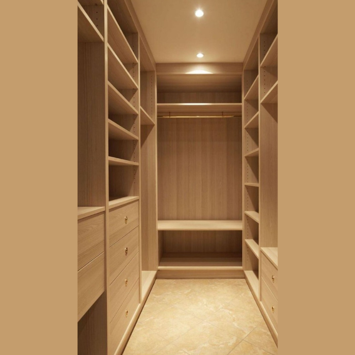The Luxe Walk-In Closet System is an elegant and spacious storage solution designed for luxurious bedrooms. Crafted from high-quality light wood, this closet features multiple adjustable shelves, hanging rods, and integrated drawers for organized storage of clothes, shoes, and accessories. Enhanced with built-in ceiling lighting for a premium feel, it includes a central bench for convenience. Its durable construction and customizable design make it ideal for maximizing space and style in any dressing area. Dimensions: [customizable based on need].