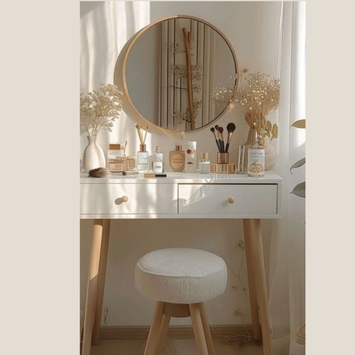 Accented with neutral tones and a clean design, this vanity set fits seamlessly into any bedroom, dressing area, or studio. Its **Scandinavian-inspired aesthetic** creates a calming atmosphere, while the spacious surface provides room for perfumes, brushes, and décor pieces.