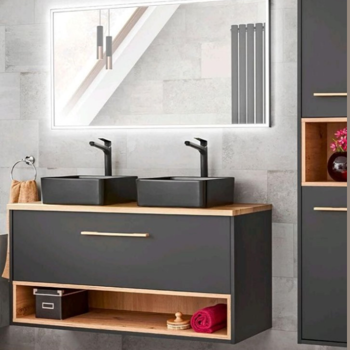 Elevate your bathroom with the Modern Dual Sink Vanity Unit with LED Mirror, a sleek and functional addition to any contemporary home. This stylish vanity unit features a matte black finish paired with a warm wooden countertop, creating a perfect blend of modern elegance and natural warmth. Designed with two spacious black ceramic sinks, it offers ample space for shared use, making it ideal for busy households. The integrated LED mirror provides bright, even lighting, enhancing your daily grooming routine with a touch of luxury. With a lower open shelf for storage and a soft-close drawer for essentials, this unit combines practicality with sophisticated design. The accompanying tall cabinet with a wooden accent and vibrant floral decor adds extra storage and a pop of color. Perfect for maximizing space and style, this vanity unit transforms your bathroom into a serene and organized retreat.
