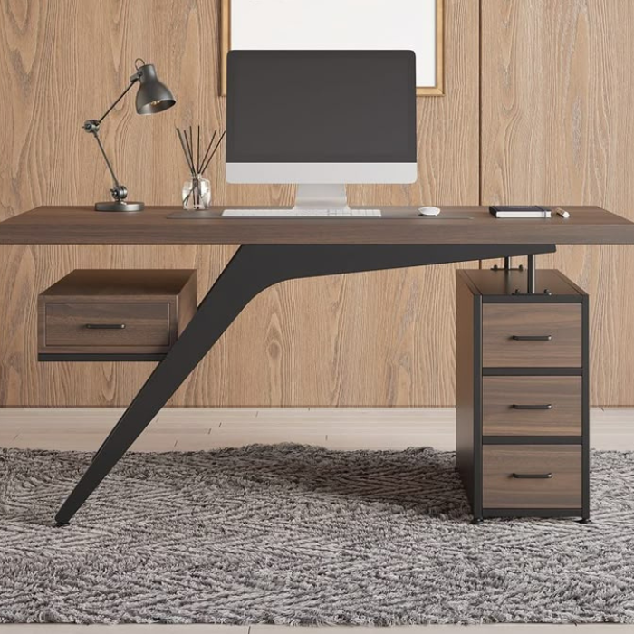 The Modern Ergonomic Desk is a sleek and stylish addition to any home or office workspace. Crafted with a rich wood finish, this desk features a minimalist design with a sturdy black metal frame that provides excellent support and stability. The desk includes a spacious tabletop, perfect for accommodating a computer monitor, keyboard, and other essentials, along with a built-in drawer on the left side for convenient storage of small items. On the right, a matching pedestal with three drawers offers additional storage space for files, supplies, and personal belongings. The desk is complemented by a modern desk lamp with an adjustable arm, ideal for focused lighting during late-night work sessions. A small vase with decorative reeds adds a touch of elegance to the setup. The desk sits atop a soft, textured rug that enhances the room's aesthetic while providing comfort underfoot. Designed with ergonomics in mind, this desk promotes a healthy posture, making it an ideal choice for long hours of productivity.