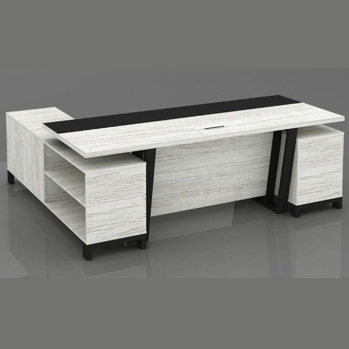 Modern Executive Desk is a sleek and modern addition to any professional workspace, designed to combine functionality with contemporary style. Crafted with a white wood grain finish and accented with a contrasting black tabletop, this desk offers a sophisticated aesthetic that enhances any office environment. The L-shaped design provides ample workspace and includes integrated storage solutions with open shelves on one side and a closed cabinet on the other, perfect for organizing files, books, and office supplies. The sturdy black metal legs ensure durability and stability, while the smooth surface features a convenient cable management slot to keep your workspace tidy. With its reflective base and minimalist design, the Lumora Executive Desk is ideal for executives and professionals seeking a blend of practicality and elegance.