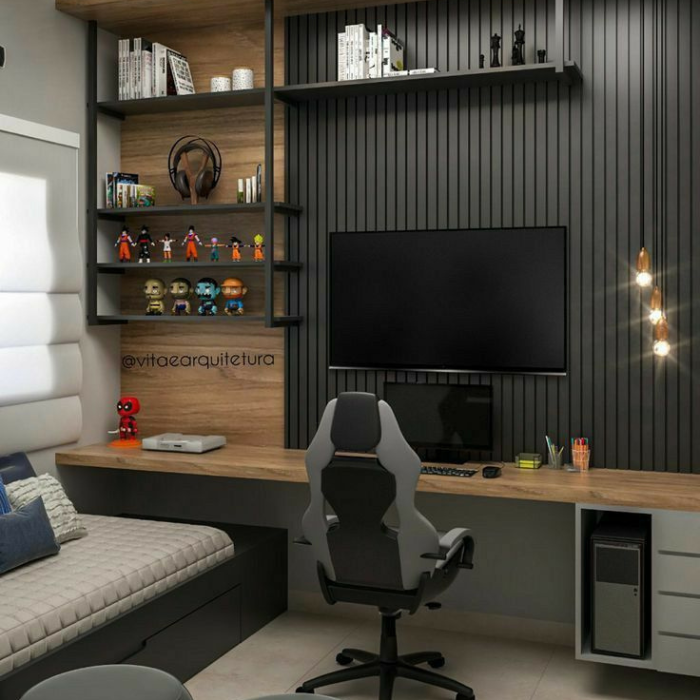 The modern gaming and workspace setup is a stylish and functional solution designed for both gaming enthusiasts and professionals needing a dedicated workspace. This all-in-one setup features a sleek wooden desk with a minimalist design, perfect for housing a computer, monitor, and accessories. The desk is complemented by a comfortable ergonomic chair that provides excellent lumbar support and adjustable height, ensuring long hours of use without discomfort. A built-in daybed with cushioned upholstery offers a convenient spot for relaxation or a quick nap, complete with storage drawers underneath for keeping essentials organized. The setup includes a vertical wooden shelving unit with multiple tiers, ideal for displaying collectibles, books, and headphones, adding a personalized touch to the space. A large flat-screen monitor mounted on the wall enhances the gaming and work experience with its immersive display, while stylish pendant lights provide focused illumination. The dark vertical paneling on the wall creates a sophisticated backdrop, and the inclusion of decorative items like action figures adds a playful yet cohesive aesthetic. This setup is perfect for those seeking a blend of productivity and entertainment in a compact, modern design.
