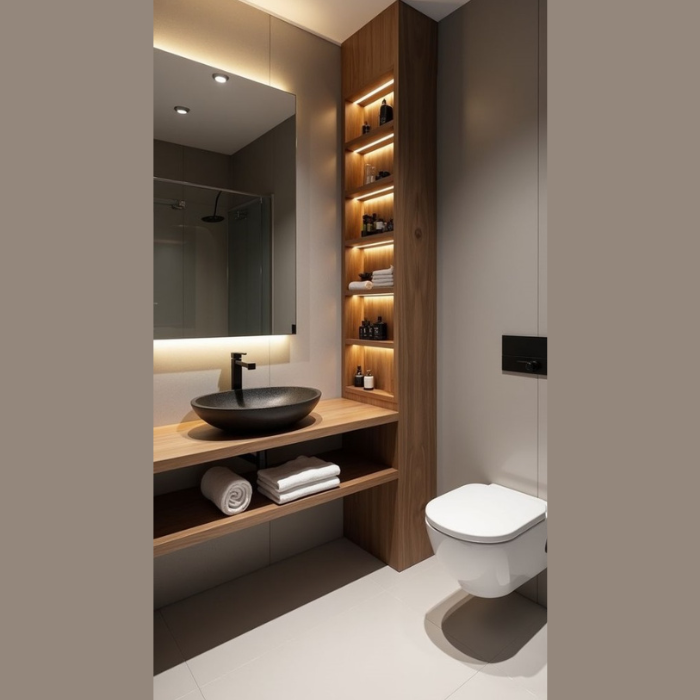 The Modern Minimalist Bathroom Vanity Set is a sleek and stylish addition to any contemporary bathroom. Crafted with high-quality wood and finished in a warm natural tone, this vanity set combines functionality with elegant design. Featuring a unique vessel sink with a matte black finish, the set includes a spacious open shelf for storage, ideal for neatly organizing towels and toiletries. The integrated backlit mirror adds a touch of sophistication and provides ample illumination for daily routines. Paired with a wall-mounted toilet, this set maximizes floor space, creating a clean and uncluttered look. The soft, neutral color palette with subtle lighting accents enhances the modern aesthetic, making it a perfect fit for small to medium-sized bathrooms.