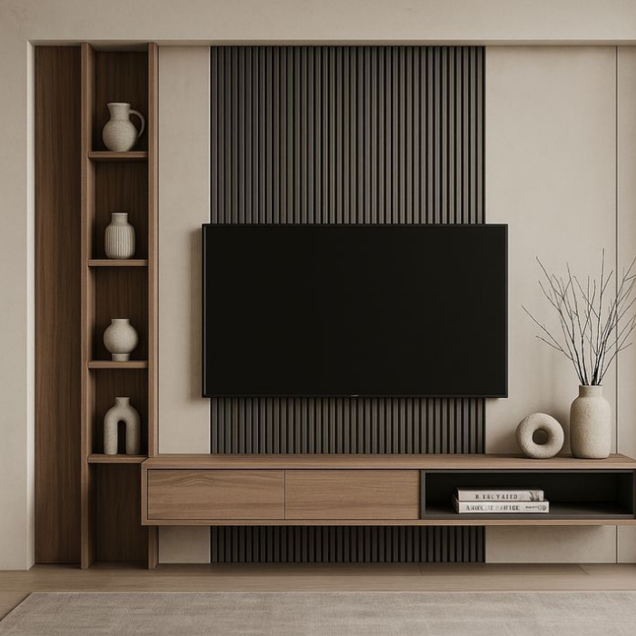 Elevate your living space with the Modern Minimalist TV Console Set, a sleek and sophisticated furniture piece designed for contemporary homes. This set features a stylish wooden TV console with two spacious drawers and an open shelf, perfect for storing media devices and displaying decorative items. The vertical slat panel backdrop adds a touch of texture and elegance, complementing the neutral color palette of beige and dark wood tones. Accompanied by a tall shelving unit with multiple tiers, it showcases minimalist ceramic vases and decor, enhancing the aesthetic appeal. Crafted with high-quality materials, this set offers both functionality and a chic design, ideal for organizing your entertainment area with a clean, modern look.