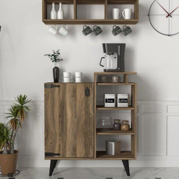 Elevate your kitchen decor with this Modern Kitchen Storage Cabinet, designed to combine functionality with sleek style. Crafted from high-quality wood with a rich, natural finish, this cabinet features a spacious lower compartment with stylish metal hinges for secure storage of kitchen essentials. The open shelving unit includes designated spaces for a coffee maker, cups, and jars labeled for tea and coffee, perfect for organizing your morning brew station. A top shelf with cubby holes and hanging hooks accommodates additional mugs and decorative items, while the minimalist black metal legs add a contemporary touch. Paired with a potted plant and a wall clock, this cabinet brings a cozy yet modern vibe to any kitchen space.