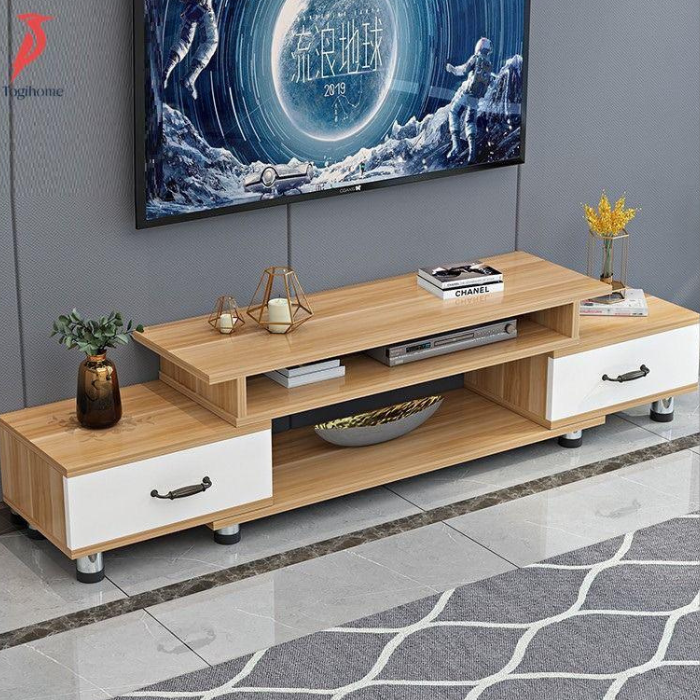 Enhance your living space with this sleek Modern Two-Tier TV Stand with Storage, featuring a stylish two-tone design in natural wood and crisp white finishes. This versatile stand includes two spacious drawers with elegant black handles for concealed storage, perfect for organizing media accessories or personal items. The open shelves provide ample space for a DVD player, soundbar, or decorative pieces like books and vases. Supported by sturdy metal legs, this TV stand combines functionality with a contemporary aesthetic, ideal for TVs up to 55 inches. The smooth surface and thoughtful design make it a perfect addition to any modern home decor.