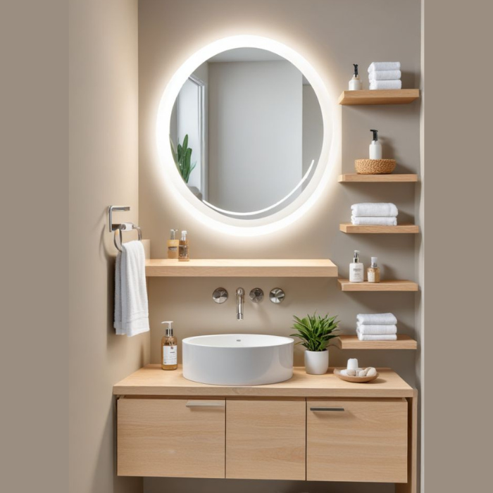 Elevate your bathroom with this stylish and modern vanity set. Featuring a sleek, round illuminated mirror with a warm LED glow, this set creates a bright and inviting atmosphere. The wooden vanity unit, with its minimalist design and ample storage cabinets, complements the floating shelves that provide convenient space for towels, toiletries, and decorative plants. The vessel sink adds a contemporary touch, paired with a stylish faucet and towel holder. Perfect for small spaces, this vanity combines functionality with elegant design to transform your daily routine.