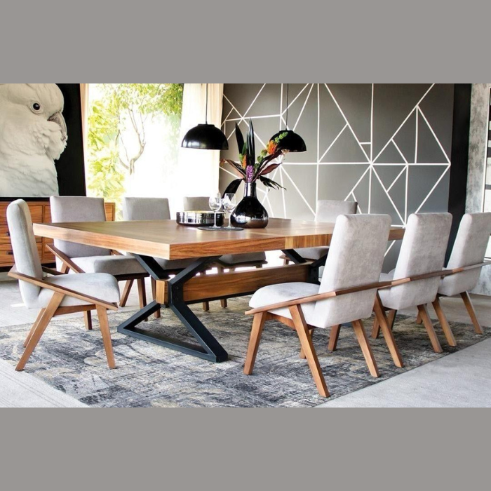 Crafted from premium walnut wood with a rich, natural finish, this rectangular table features a bold black metal X-shaped base for exceptional stability and style. Perfectly seating eight, it’s ideal for family dinners or elegant gatherings. Paired with its matching upholstered chairs, this table brings a sophisticated yet warm ambiance to any home. Elevate your interior with the Nexus Elegance—available now!