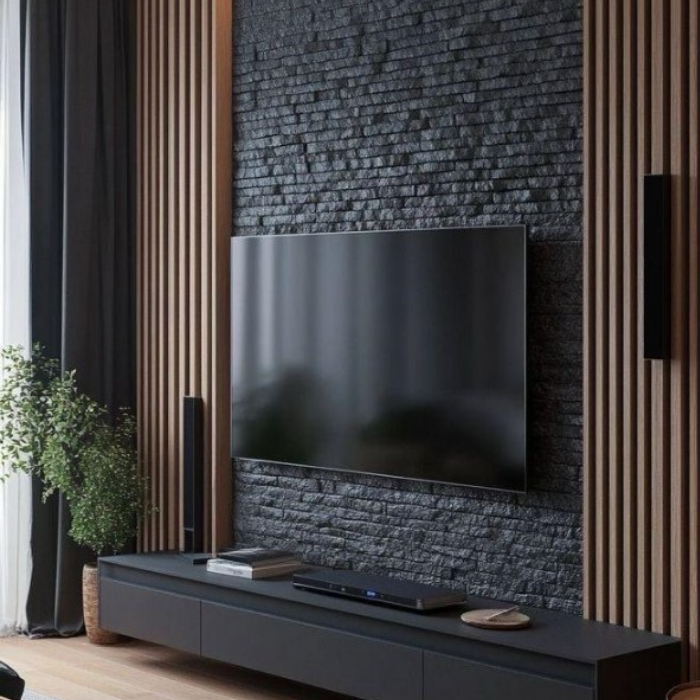 Transform your living space with the Obsidian TV Console Set, a striking blend of modern design and rustic elegance. This set features a sleek, matte-black TV console with ample storage, complemented by a textured black brick wall panel for a bold backdrop. Flanking the setup are stylish wooden slat accents that add warmth and sophistication. Designed to accommodate large flat-screen TVs, this all-in-one unit includes space for media devices and decorative items, creating a seamless and contemporary entertainment center perfect for any stylish home.