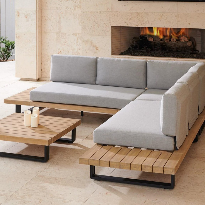The Outdoor Serenity Sectional Sofa Set is designed to bring comfort and style to your outdoor living space, perfect for relaxing by the fireplace or enjoying a cozy evening with loved ones. Crafted with a durable teak wood frame, this sectional sofa features a natural finish that enhances its elegant appeal while resisting weather elements for long-lasting use. The plush, light gray cushions are made from high-quality, water-resistant fabric, ensuring both comfort and easy maintenance. This set includes a spacious L-shaped sofa and a matching coffee table, ideal for entertaining or casual lounging. The coffee table, also constructed from teak wood, provides a sturdy surface for drinks, books, or decorative items like the included candles, adding a warm ambiance to your patio or garden. With its sleek black metal accents and slatted design, this sofa set combines modern aesthetics with practical functionality, making it a versatile addition to any outdoor setting.