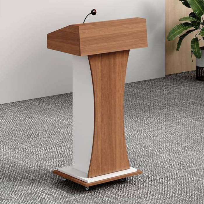 Pinnacle Glide Podium redefines presentation elegance with its sophisticated design, featuring a sturdy wooden structure finished in a rich natural tone atop a smooth white base, complete with a built-in microphone and adjustable stand, making it an ideal choice for buyers seeking a versatile and professional speaking solution. The podium’s ergonomic slope provides ample space for notes or tablets, while its integrated casters ensure effortless mobility across conference rooms, auditoriums, or event spaces, perfect for showcasing in office furniture advertisements or educational facility listings. The curved silhouette and minimalist aesthetic blend seamlessly with modern interiors, offering a touch of class that enhances corporate branding or public speaking engagements. Crafted for durability and functionality, this podium includes cable management to maintain a tidy appearance, appealing to businesses, schools, or event organizers looking to elevate their presentations with a portable, stylish, and reliable centerpiece that stands out in the market.
