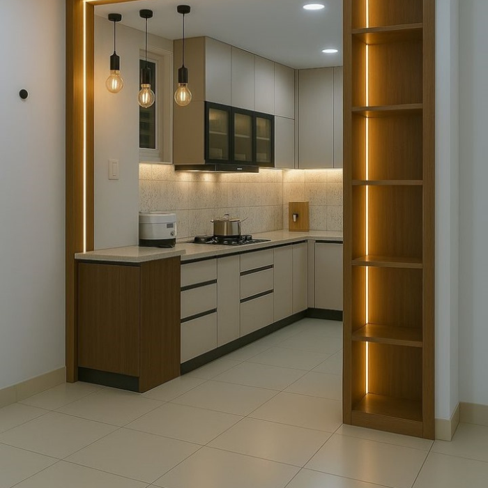 Revolutionize your kitchen experience with the Radiant Flow Kitchen Cabinet, a stunning fusion of contemporary style and cutting-edge functionality. Crafted with a sleek combination of light grey lacquered panels and warm wood accents, this L-shaped cabinet system offers generous storage with overhead cabinets featuring glass-fronted doors and deep, smooth drawers. The standout feature is the integrated LED lighting along the shelves, under-cabinet spaces, and the surrounding frame, casting a warm, ambient glow that enhances both aesthetics and usability. Complemented by stylish pendant lights with exposed bulbs, the design includes a spacious countertop ideal for cooking or casual dining. Built with durable materials, the Radiant Flow Kitchen Cabinet brings elegance, efficiency, and a modern glow to your home—available now!