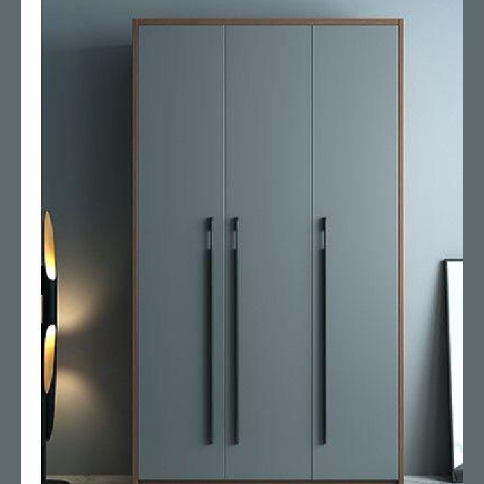 The Sleek Modern Wardrobe is a sophisticated storage solution designed for contemporary living spaces. Featuring a stylish gray finish with a contrasting wood trim and sleek black handles, this three-door wardrobe offers ample concealed storage for clothes, shoes, and accessories. Its minimalist design and sturdy construction make it a perfect fit for any bedroom, providing a clean and organized look. Easy to assemble and customizable, this wardrobe enhances both functionality and aesthetic appeal. Dimensions: [customizable based on need].