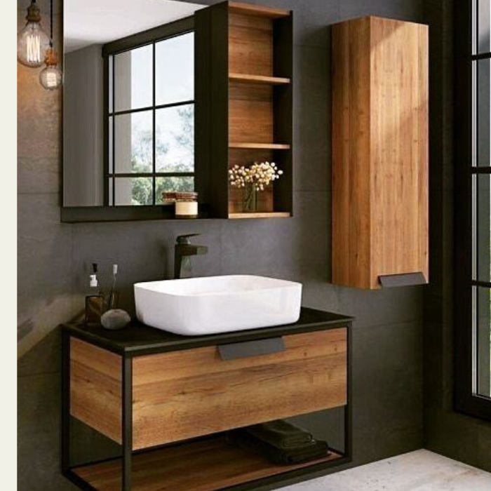 Transform your bathroom with the Industrial Style Single Sink Vanity with Mirror Cabinet, a perfect fusion of rugged charm and modern functionality. This vanity features a robust black metal frame paired with a warm, natural wood finish, creating a striking industrial aesthetic. The spacious white ceramic sink sits atop a sleek countertop, complemented by a soft-close drawer for organized storage. Above, a matching mirror cabinet with open shelves offers additional space for toiletries and decorative items, enhanced by a minimalist design and soft lighting from pendant lamps. The tall wooden side cabinet provides extra vertical storage, ideal for towels and essentials. This unit combines durability, style, and practicality, making it a standout addition to any contemporary bathroom.