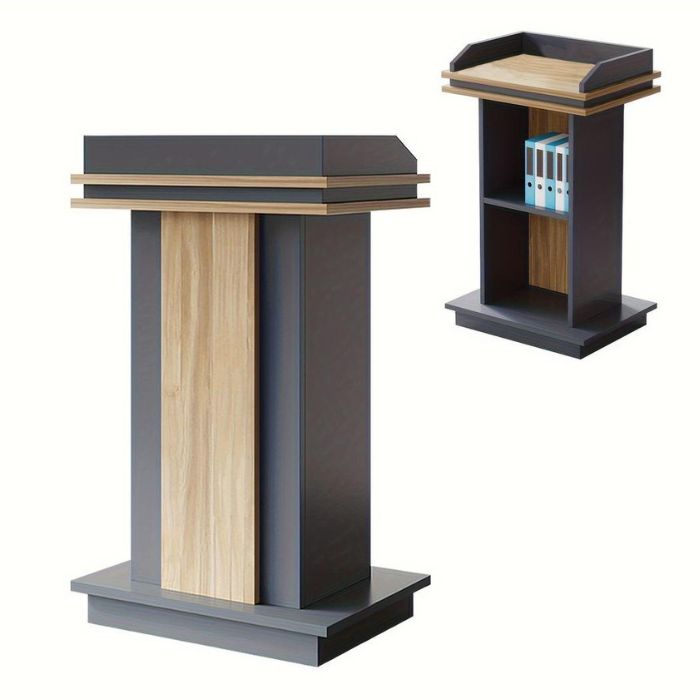 Summit Pulse Podium blends contemporary style with practical functionality, featuring a sleek gray and wood finish with layered wooden accents that create a sophisticated look, making it an excellent choice for buyers seeking a versatile speaking solution for conferences, classrooms, or corporate events. The podium’s spacious top provides ample space for notes or devices, while the integrated open shelf offers convenient storage for documents or presentation materials, ideal for showcasing in office furniture catalogs or educational supply advertisements. The combination of smooth gray panels and warm wooden slats adds a touch of elegance and texture, seamlessly integrating with modern interiors and enhancing the professional atmosphere of any setting. Crafted from durable materials, this podium ensures longevity and stability, appealing to businesses, educators, or public speakers looking to elevate their presentations with a stylish, compact, and functional centerpiece that stands out in the market.
