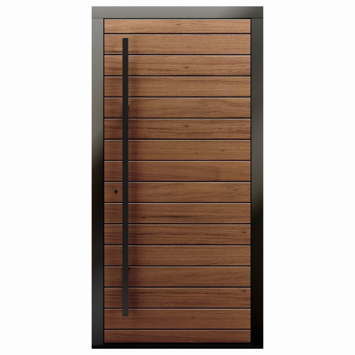 This entry door is designed with a vertical handle integrated into the wood, providing both functionality and a minimalist look. The handle is strategically placed for easy access and adds a touch of industrial style to the overall design. The TimberPulse Entry Door is built to offer excellent insulation, keeping interiors comfortable year-round while reducing energy costs.