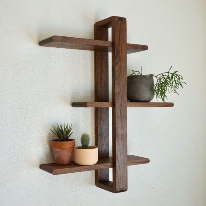 The Verdant Rise Shelving Unit is a stylish and innovative wall-mounted storage solution crafted from rich, dark walnut wood, bringing a touch of natural elegance to any room. This uniquely designed unit features a vertical frame with intersecting shelves at varying heights, creating a dynamic and modern display area. The open shelving design includes four spacious tiers, each with smooth, rounded edges, offering ample space to showcase potted plants, books, or decorative items. Perfectly suited for small spaces, it mounts securely to the wall with included hardware, ensuring stability and safety. The natural wood grain adds warmth and texture, complementing a variety of interior styles from minimalist to bohemian. Easy to assemble and maintain, this shelving unit is ideal for plant enthusiasts or anyone looking to enhance their living space with a blend of functionality and aesthetic appeal.