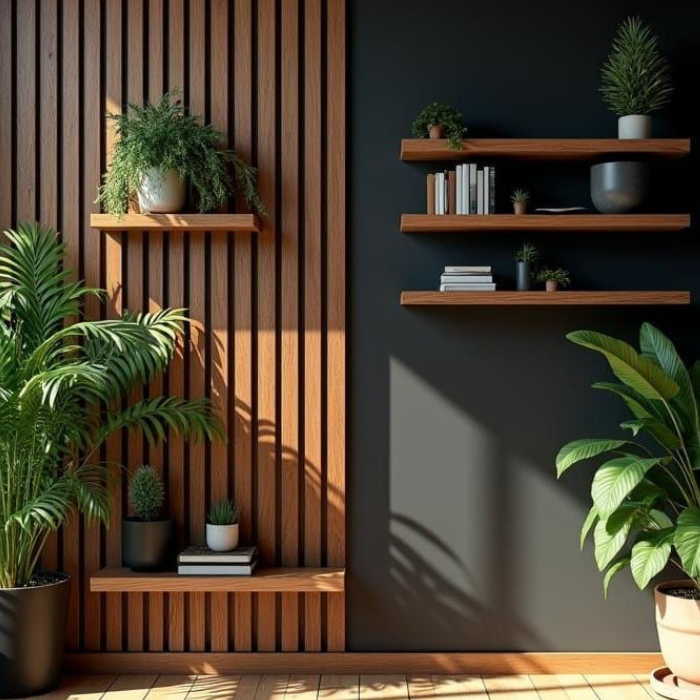 Bring nature indoors with the Verdant Slat Shelf Set, a chic and functional wall-mounted shelving solution designed to enhance any modern interior. This set features a striking wooden slat panel in a warm natural finish, paired with three floating shelves that provide ample space for your favorite items. Measuring approximately 48 inches in height and 24 inches in width, the shelves are ideal for showcasing potted plants, neatly arranged books, and decorative accents, creating a harmonious blend of greenery and organization. The contrasting dark wall backdrop highlights the rich wood tones, while the open design allows for customizable arrangements. Easy to install and crafted with durable materials, the Verdant Slat Shelf Set is perfect for living rooms, bedrooms, or offices, offering both aesthetic appeal and practical storage in one elegant package.