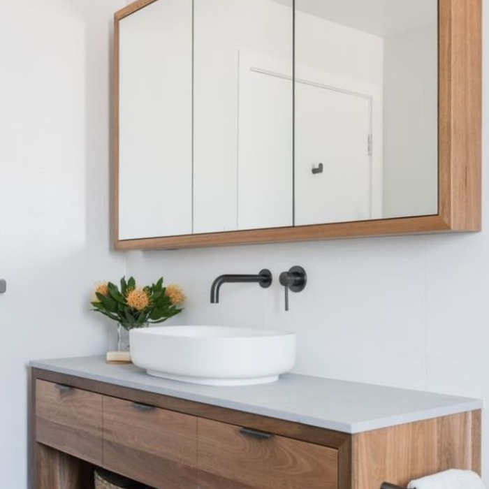Above, the large mirrored cabinet framed in wood provides additional storage, keeping essentials hidden while reflecting light to make your bathroom feel more open and bright.
