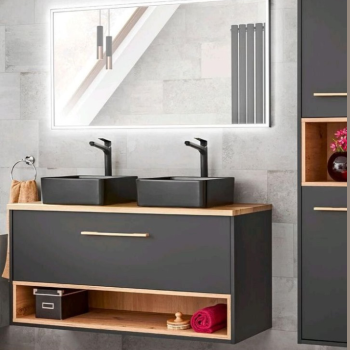 Elevate your bathroom with the Modern Dual Sink Vanity Unit with LED Mirror, a sleek and functional addition to any contemporary home.