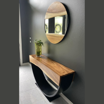 The Arcwood Console with Mirror is a stunning entryway set featuring a curved wooden console table and a matching round mirror, perfect for adding elegance and functionality to your hallway...