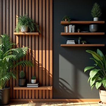 The Verdant Slat Shelf Set is a stylish wall-mounted shelving unit with a wooden slat backdrop and three floating shelves, perfect for displaying plants, books, and decor in a modern...