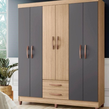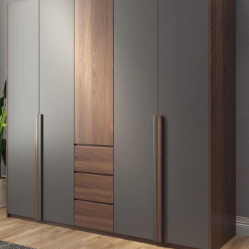 The Dual-Tone Modern Wardrobe with Drawers is a stylish and functional storage solution for contemporary bedrooms. Featuring a combination of warm wood and sleek gray finishes, this wardrobe includes four...